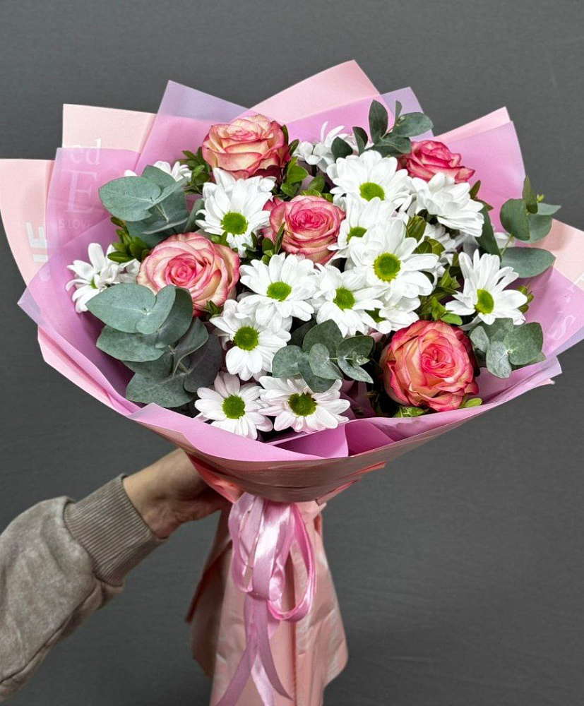 Композиция из роз, хризантемы, альстромерий и диантусов